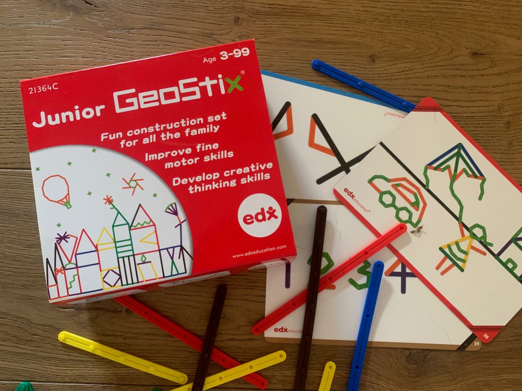 I giochi che hanno sono tantissimi, noi abbiamo provato anche i JUNIOR GEOSTIX, delle bacchette colorate di varie misure che si possono unire con dei bottoncini con le quali si possono costruire mille figure per poter creare tutto quello che si vuole.